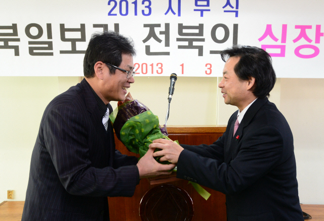 ▲ 지난 3일 전북일보 시무식에서 서창훈 회장이 '2012올해의 전북인'에 수상한 조지훈 전주시의원에게 꽃다발을 전달하고 있다. 추성수기자chss78@