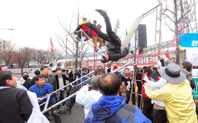 1일 전주종합경기장 앞 도로를 불법으로 점거하고 있는 공공운수노조 택시지부의 불법 구조물을 덕진구청 직원들이 행정대집행을 하고 있다.