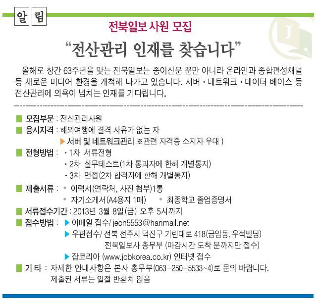 [전북일보 알림]전산관리 인재를 찾습니다.