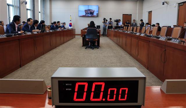 국회는 26일 여당인 새누리당의 요구로 전년도 결산안 심의를 위해 농림수산식품해양수산위원회를 비롯한 4개 상임위 전체회의를 열었으나 첫날부터 국정원 댓글의혹 사건에 대한 박근혜 대통령의 책임있는 조치를 요구하며 장외투쟁 중인 민주당의 불참으로 회의가 정상적으로 진행되지 못해 파행을 겪었다. 사진은 이날 오후 야당 의원들이 불참한 가운데 열린 산업통상자원위 전체회의장 모습. 연합뉴스