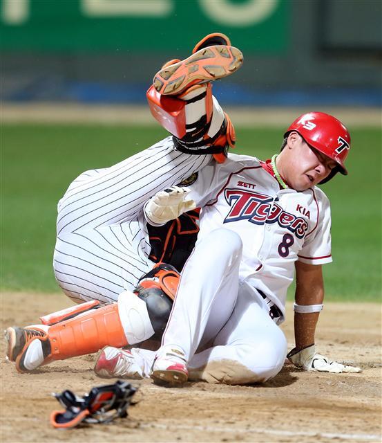 27일 광주 무등경기장에서 벌어진 롯데 자이언츠와 KIA 타이거즈의 경기. 4회 무사 1, 3루 4번 나지완 타석때 3루 주자 안치홍이 도루로 홈에 들어와 세이프되고 있다. 연합뉴스
