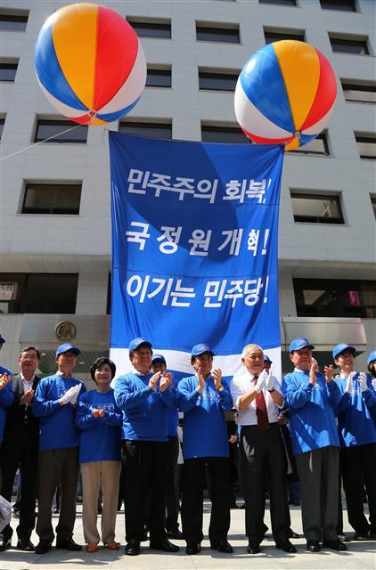 민주당이 1일 당사를 9년만에 여의도로 이전하고 당 상징색을 파란색으로 변경했다. 김한길 대표와 의원, 당직자들이 이날 여의도 새누리당 당사 맞은 편인 대산빌딩에서 열린 새 당사 입주식에서 대형 현수막을 내걸며 박수를 치고 있다. 연합뉴스