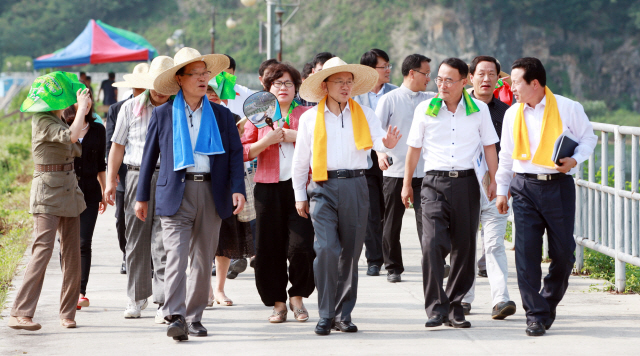 지난달 30일 김완주 전북도지사와 도내 4대 종교 관계자들이 완주 금구 소재지부터 귀신사까지 이동하며 아름다운 순례길 위험 구간 현장 점검을 하고 있다. 사진 제공=전라북도