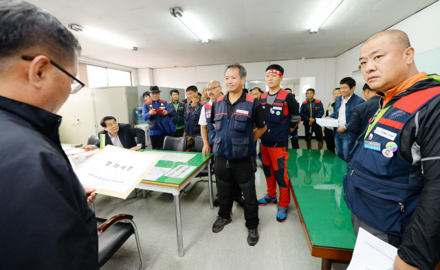 민노총 전국공공운수노조 전북버스지부가 10일 전주시내버스공동관리위원회 앞에서 버스 감차 결의와 관련해 기자회견을 열고 위원회에 항의서한을 전달하고 있다. 전북버스지부는 이날 "시민과 버스노동자의 생존권을 볼모로 잡고 협박하는 시내버스공동관리위를 규탄한다"고 밝혔다.