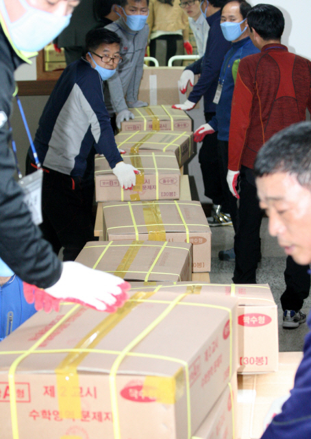 2014학년도 대학수학능력평가를 이틀 앞둔 5일 전주 교육청에 시험지가 도착해 관계자들이 봉인된 시험지를 옮기고 있다.