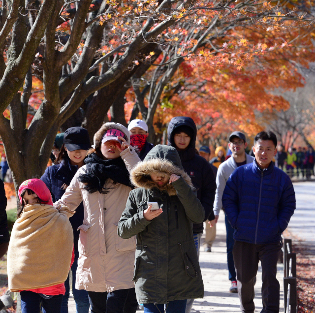 쌀쌀한 날씨 속에서도 10일 정읍 내장산에는 절정에 달한 국내 최고의 단풍을 즐기기 위해 탐방객들이 몰렸다. 탐방객들이 강한 바람에 몸을 움츠린 채 털모자를 눌러 쓰고 등산로를 걷고 있다.