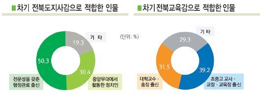 도민들은 중앙무대에서 활동한 정치인보다는 전문성을 갖춘 행정관료 출신이 차기 전북도지사를 맡아야 한다는 견해에 더 공감하는 것으로 나타났다. 또 교육감은 대학교수·총장 출신보다 초·중·고교의 교사 및 교장, 교육장 출신이 더 적합하다는 견해를 보였다.