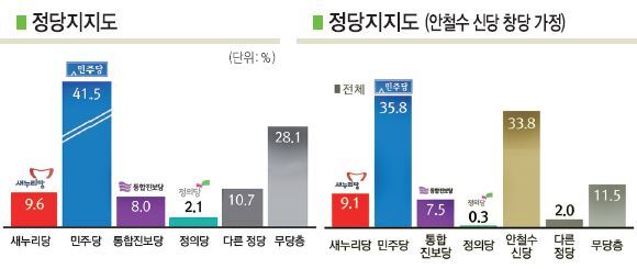또 무소속 안철수 의원의 신당 창당을 가정한 정당 지지도에서는 민주당이 35.8%의 지지율로 33.8%의 지지를 얻은 안철수 신당을 오차범위 내에서 앞서며 접전을 벌였다. 이어 새누리당 9.1%, 통합진보당 7.5%, 정의당 0.3%, 다른 정당 2.0%로 나타났으며 무당층은 11.5%로 줄었다.
