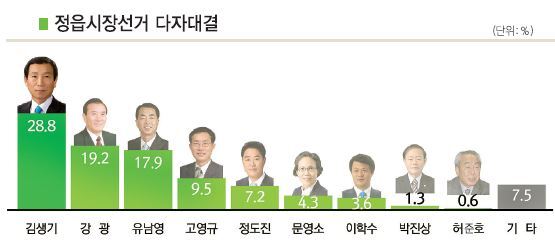 전북일보가 여론조사 전문기관인 ‘리서치뷰’에 의뢰, 지난 4일 정읍시에 거주하는 성인남녀 500명을 대상으로 실시한 여론조사 결과, 가상 다자대결(9명)에서 김생기 현 시장이 28.8%의 지지를 얻어 강광 전 시장(19.2%)과 유남영 정읍농협 조합장(17.9%)을 제치고 선두를 달렸다. 이어 고영규 전북도의원(9.5%), 정도진 정읍시의원(7.2%), 문영소 정읍시의원(4.3%) 등이 뒤를 이었다.