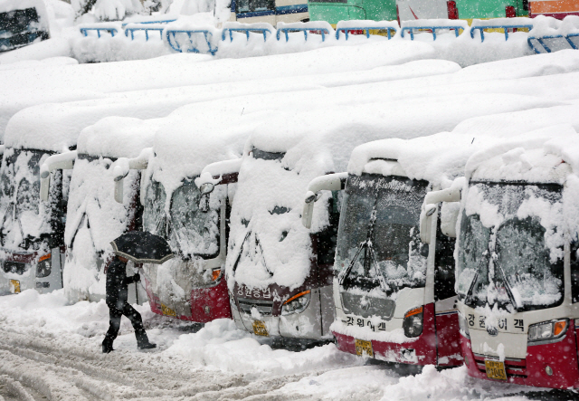 강원 동해안 지역에 지난 6일부터 엿새 동안 1m가 넘는 ‘눈 폭탄’이 쏟아진 가운데 11일 강릉시외버스터미널에서 눈을 뒤집어쓴 시외버스가 눈이 그치기를 기다리고 있다. 지난 6일부터 이날 오전 8시까지 내린 눈의 양은 진부령 122㎝, 강릉 117㎝, 강릉(왕산) 100.5㎝, 고성(간성) 100㎝, 동해 86㎝, 속초 80.3㎝, 대관령 74㎝, 태백 33㎝, 평창 12㎝, 인제 2.5㎝ 등이다. 연합뉴스