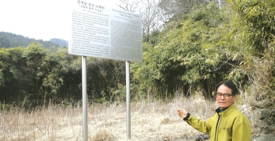 ▲ 정읍 산외면 김개남 장군 생가터에서 증손 김종기 씨가 ‘김개남 장군 고택터’ 안내판을 가리키고 있다.