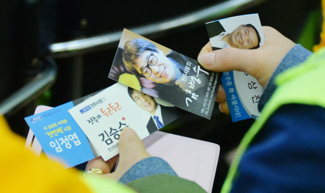 20일 전주 자원봉사센터에서 열린 좋은 이웃들 발대식에 한 참석자가 행사장에서 받은 전주시장 후보들의 명함을 보고 있다.