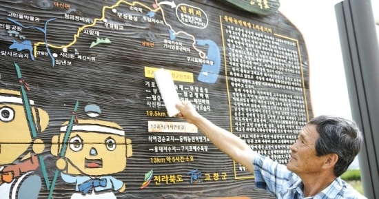 ▲ 진윤식 고창동학농민혁명기념사업회 부이사장이 무장기포지에 설치된 안내판을 가리키며 ‘동학 마실길’에 대해 설명하고 있다.