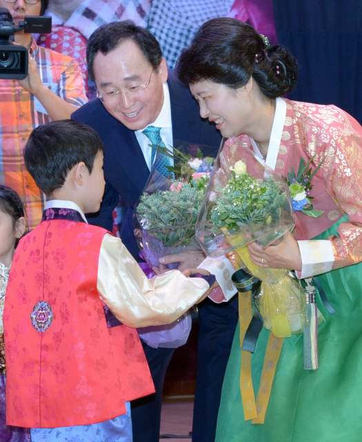 제34대 송하진 전북지사 취임식이 열린 1일 송지사 내외가 도청 취임식장에서 어린이들에게 축하 꽃다발을 받고 있다.
