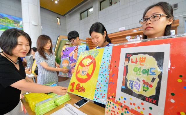 전주시 여성주간을 맞아 2일 전북여성단체연합회원들이 전주시청 로비에서 여성·아동 폭력예방 캠페인을 갖고 있다.