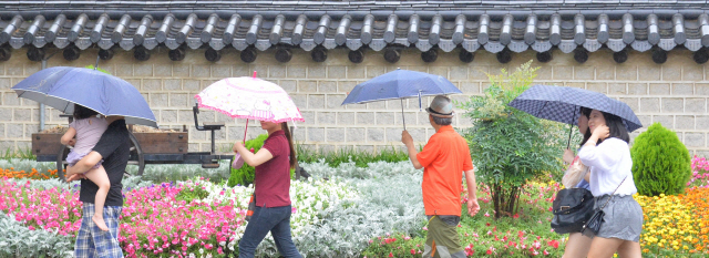 여름 가뭄을 해갈하는 반가운 단비가 내린 3일 전주 한옥마을에 시민들이 우산을 쓰고 길을 걷고 있다.