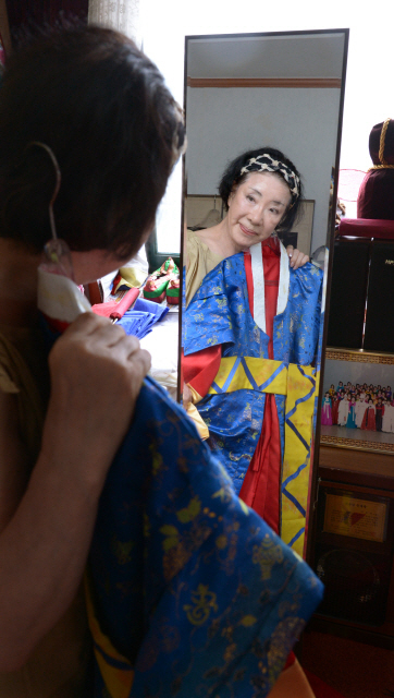 | ▲ 30여년의 이민생활을 접고‘여성국극’발전기금으로 전 재산을 털어 부활의 꿈을 실현하고 있는 원로배우 이소자 선생이 직접 만든 의상을 바라보며 흐뭇해 하고 있다. 안봉주기자 bjahn@ | ||