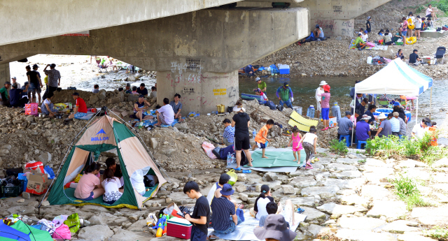 장마가 지나가고 무더위가 찾아온 27일 전주 색장동 안적교를 찾은 많은 시민들이 다리밑에서 물놀이를 하며 더위를 식히고 있다.