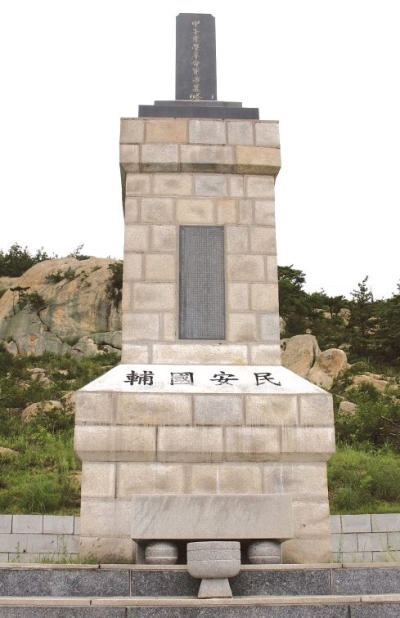 ▲ 충남 태안 백화산 자락에 조성된 갑오동학혁명군 추모탑. 뒤로 보이는 바위 봉우리가 교장바위다.
