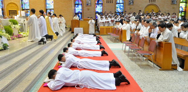 15일 전주 중앙성당에서 열린 사제·부제 서품식에서 후보자로 선출된 사제 5명과 부제 3명이 바닥에 엎드린 채 세상에서 가장 낮은 이가 되어 섬길 것을 다짐하는 부복을 하고 있다.