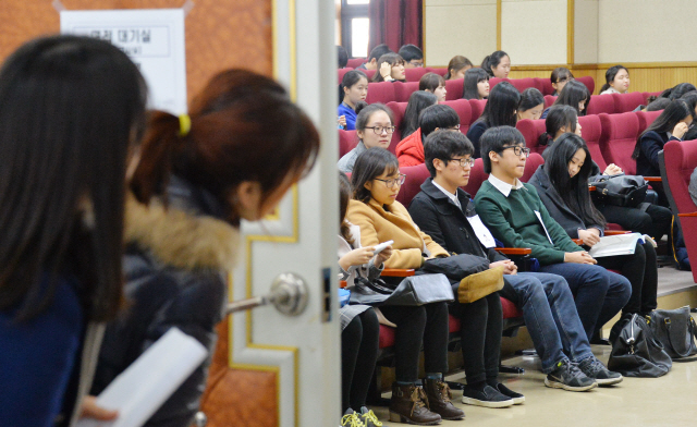 전주교육대학 2015학년도 정시모집 면접고사가 15일 교대 교사교육센터에서 열린 가운데 면접 순서를 기다리는 학생들을 학부모들이 걱정스레 바라보고 있다. 전주교대는 260명을 모집하는 일반전형에 780명이 지원해 3대 1의 경쟁률을 기록했다.