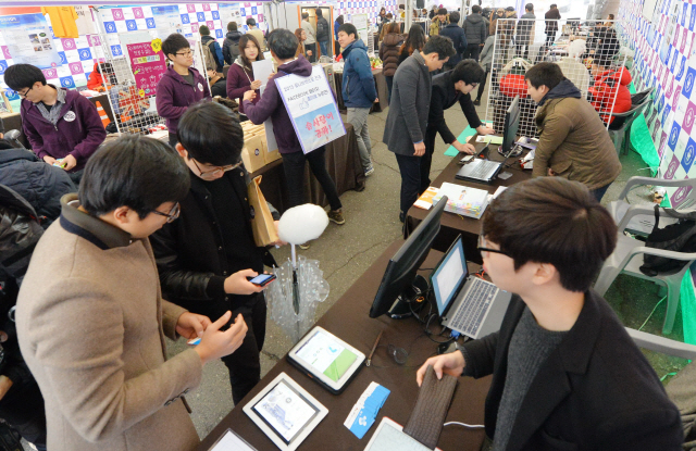 지난 16일 전북대학교 옛 정문 앞에서 열린 ‘전대 창업 한마당’에서 학생들이 학생 창업가들의 톡톡 튀는 아이이어 상품들을 둘러보고 있다.