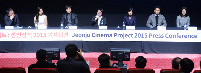 19일 전주 디지털독립영화관에서 열린 전주영화제 삼인삼색 2015 발표회에서 김희정, 이현정 감독과 김태훈, 박소담, 이선호, 신윤주씨 등 배우들이 기자회견을 갖고 있다.