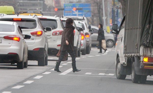 21일 전주시 전동 팔달로에서 시민이 달리는 차량 사이로 무단횡단을 하고 있다. 이날 국토교통부 발표에 따르면 전북지역의 교통문화지수는 전국 17개 시·도 중 15위로 최하위권에 그쳤다.