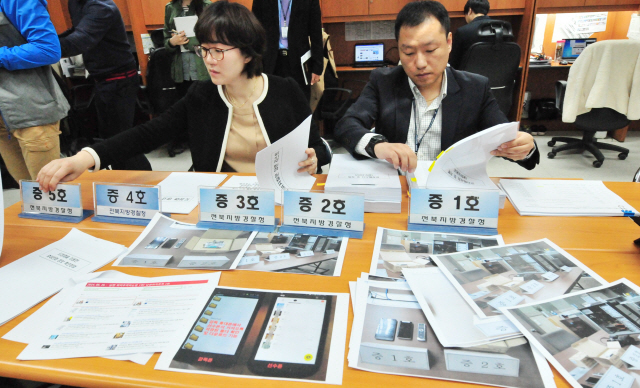 ▲ 전북지방경찰청 사이버 수사대 경찰들이 13일 전북경찰청 브리핑룸에서 스마트폰 불법도청 앱을 판매한 혐의(통신비밀 보호법 위반 등)로 구속된 조모 씨의 증거품을 공개하고 있다. 추성수기자