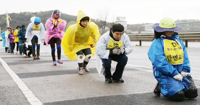 세월호 선체인양과 진실규명을 촉구하며 지난 2월 23일 진도 팽목항서 출발한 단원고 고 이승현 군의 유가족 부녀 행진단이 20일 전주에 도착하여 완산구 쑥고개에서 삼보일배를 하고 있다. 유가족 부녀행진단은 오는 6월 서울 광화문까지 세월호 진실규명을 위한 삼보일배 행진을 이어나간다.