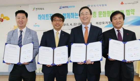 22일 완주군 한부모 가정 시설인 이산모자원에서 열린 지역 소외 아동 문화 복지 공헌활동을 위한 업무협약(MOU)에서 이균형 전북기자협회장, 오제홍 하이트진로 전북본부장, 송하진 도지사, 이종성 전북사회복지 공동모금회장(왼쪽부터) 이 협약서를 들어보이고 있다.  추성수 기자