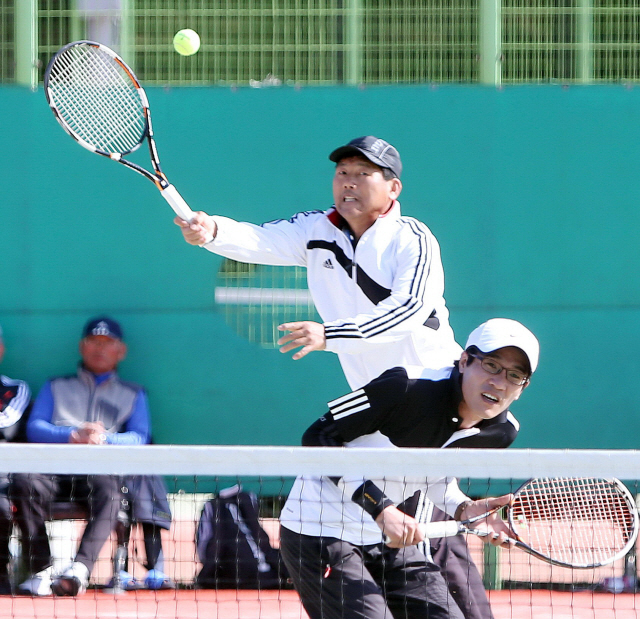 전북일보가 주최하고 전북테니스협회가 주관한 제26회 전북 직장 및 클럽 대항 테니스 대회가 25일 전주 덕진체련공원에서 열린 가운데 직장배 경기에 출전한 이영섭(전북대)선수가 열띤 경기를 펼치고 있다.