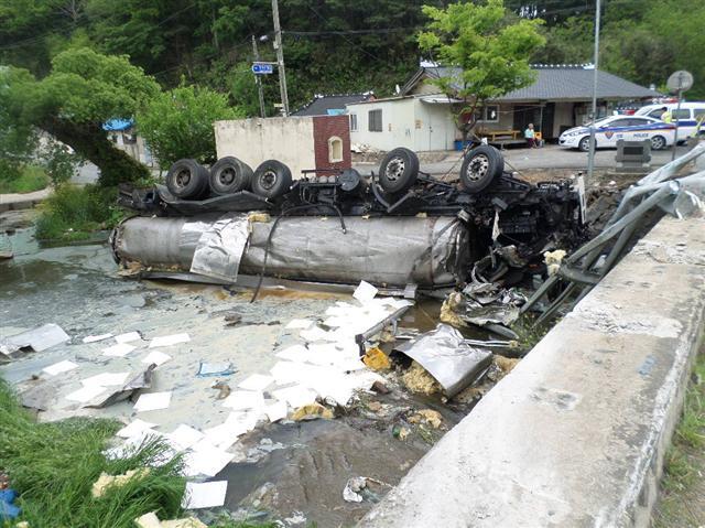 탱크로리 차량이 전복돼 운전자가 중상을 입고 소기름(우지)이 하천에 유입되는 사고가 일어났다.