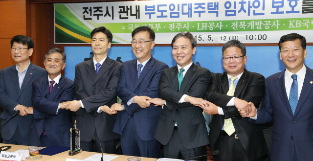 12일 전주시청 회의실에서 열린 ‘부도임대주택 임차인 보호를 위한 관계기관 역할분담 협약식’에서 김승수 전주시장을 비롯해 김윤덕 국회의원, 5개 기관 대표 등이 손을 맞잡고 있다.