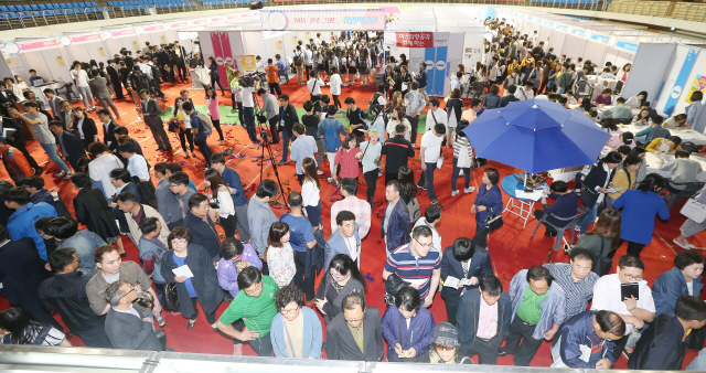 13일 전주 실내체육관에서 열린 ‘2015 전주시 그랜드 취업박람회’에 많은 구직자들이 현장면접을 보기위해 발품을 팔고 있다.