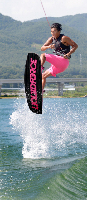 도내에 3일째 폭염특보가 내려진 5일 오후 남원 주생면 금풍저수지 수상스키장에서 동호인이 웨이크 보드를 타며 시원한 물기둥을 만들어 내고 있다.