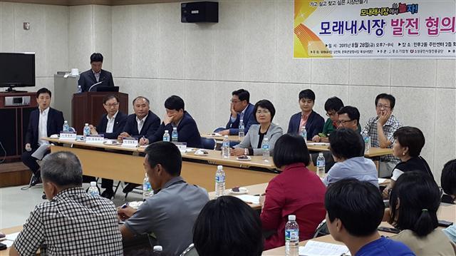 지난 28일 전주 인후2동주민센터에서 기송도 모래내시장 문화관광형육성사업단장, 임승기 모래내시장 상인회장, 전북지방중소기업청 관계자, 전주 시의원, 지역주민 등 40여명이 모인 가운데 새정치민주연합 김성주 국회의원(전주 덕진)이 마련한 모래내시장 활성화를 위한 간담회가 열렸다.