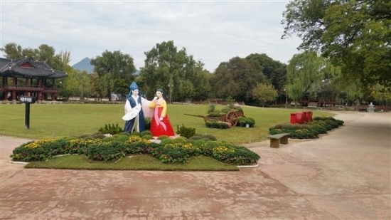 특히 가을철 대표적인 꽃인 국화꽃으로 조성된 오작교에서 춘향이와 이도령이 사랑을 속삭이고 있는 모습의 토피어리가 실물크기로 설치됐다. 또 완월정을 배경으로 국화화단을 현대식으로 조성했다.
