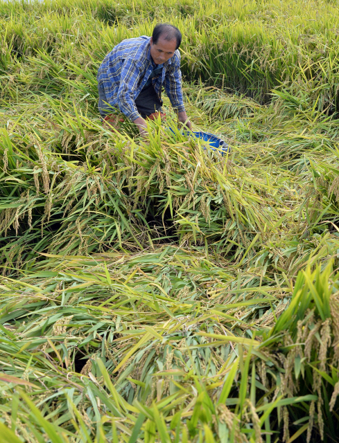 지난 1일 도내 전역에 내린 많은 비로 인해 추수를 앞둔 논에서 벼들이 쓰러진 가운데 2일 완주군 고산면에서 한 농부가 쓰러진 벼를 살펴보고 있다.