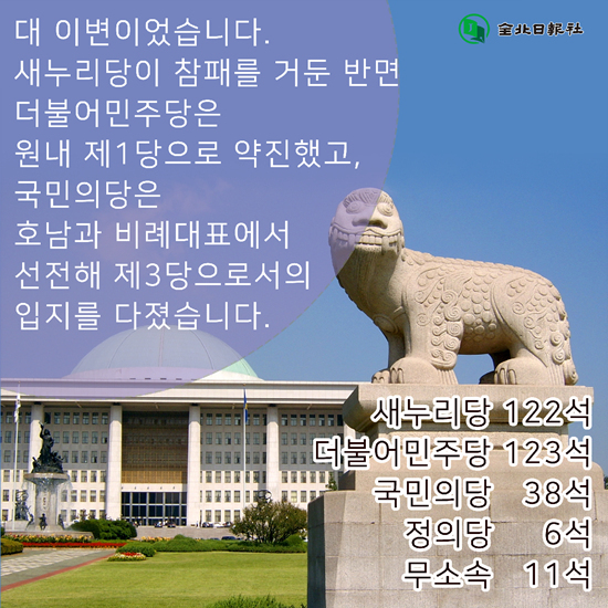 대 이변이었습니다. 새누리당이 참패를 거둔 반면 더불어민주당은 원내 제1당으로 약진했고, 국민의당은 호남과 비례대표에서 선전해 제3당으로서의 입지를 다졌습니다.