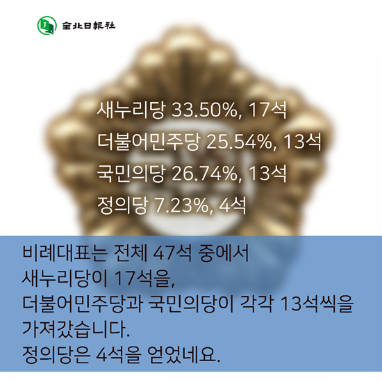 비례대표는 전체 47석 중에서 새누리당이 17석을, 더불어민주당과 국민의당이 각각 13석씩을 가져갔습니다. 정의당은 4석을 얻었네요.