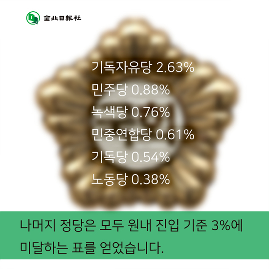 나머지 정당은 모두 원내 진입 기준 3%에 미달하는 표를 얻었네요.