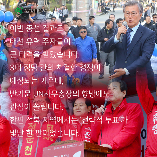 이번 총선 결과로 대선 유력 주자들이 큰 타격을 받았습니다. 3대 정당 간의 치열한 경쟁이 예상되는 가운데, 반기문 UN사무총장의 향방에도 관심이 쏠립니다.