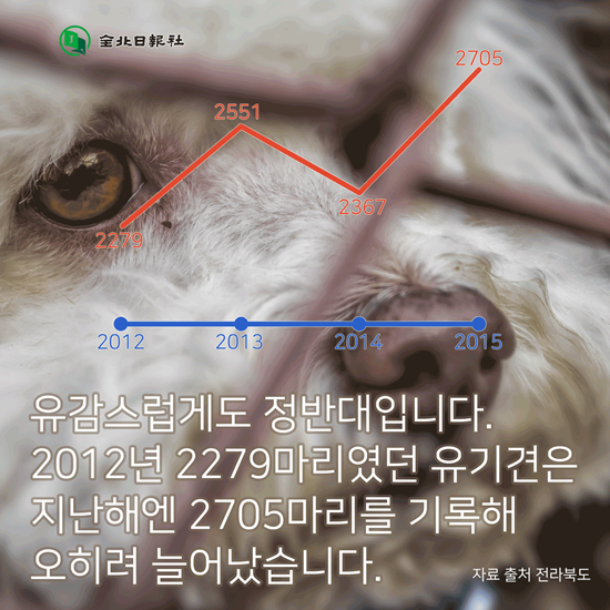 유감스럽게도 정반대입니다. 2012년 2279마리였던 유기견은 지난해엔 2705마리를 기록해 오히려 늘어났습니다.
