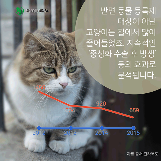 반면 동물 등록제 대상이 아닌 고양이는 길에서 많이 줄어들었죠. 지속적인 ‘중성화 수술 후 방생’ 등의 효과로 분석됩니다.