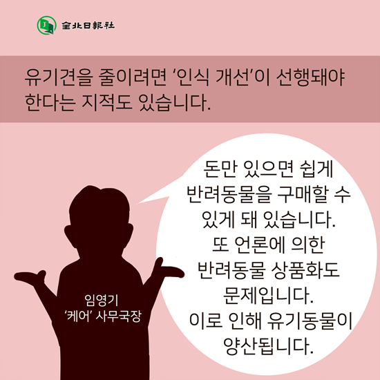 임영기 ‘케어’ 사무국장은 “돈만 있으면 쉽게 반려동물을 구매할 수 있게 돼 있다. 또 언론에 의한 반려동물 상품화도 문제다. 이로 인해 유기동물이 양산된다”고 지적합니다.
