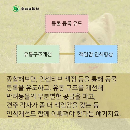 종합해보면, 인센티브 책정 등을 통해 동물 등록을 유도하고, 유통 구조를 개선해 반려동물의 무분별한 공급을 막고, 견주 각자가 좀 더 책임감을 갖는 등 인식개선도 함께 이뤄져야 한다는 얘기지요.