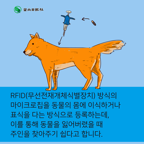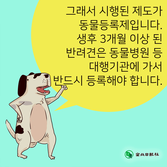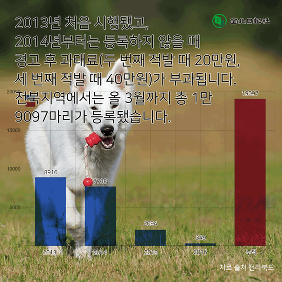 2013년 처음 시행됐고, 2014년부터는 등록하지 않을 때 경고 후 과태료(두 번째 적발 때 20만원, 세 번째 적발 때 40만원)가 부과됩니다. 전북지역에서는 올 3월까지 총 1만9097마리가 등록됐습니다.