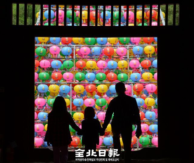 석가탄신일을 엿새 앞둔 8일 오전 완주 소양 송광사를 찾은 한 가족이 천왕문을 지나 오색 연등 앞으로 발길을 옮기고 있다.