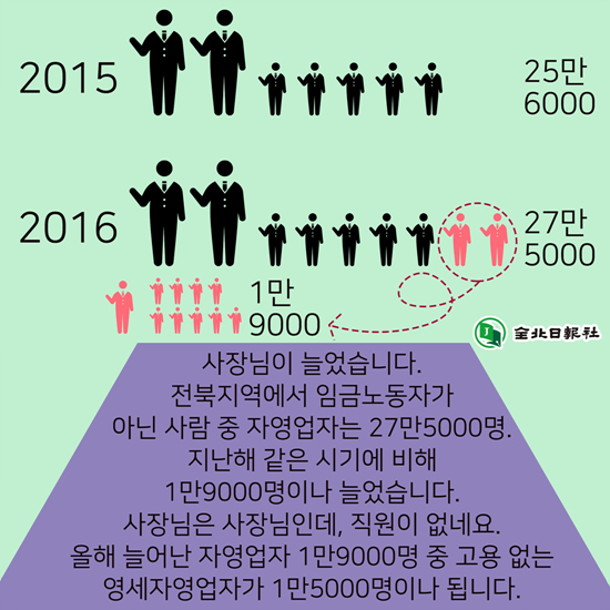 전북지역에서 임금노동자가 아닌 사람 중 자영업자는 27만5000명. 지난해 같은 시기에 비해 1만9000명이나 늘었습니다.